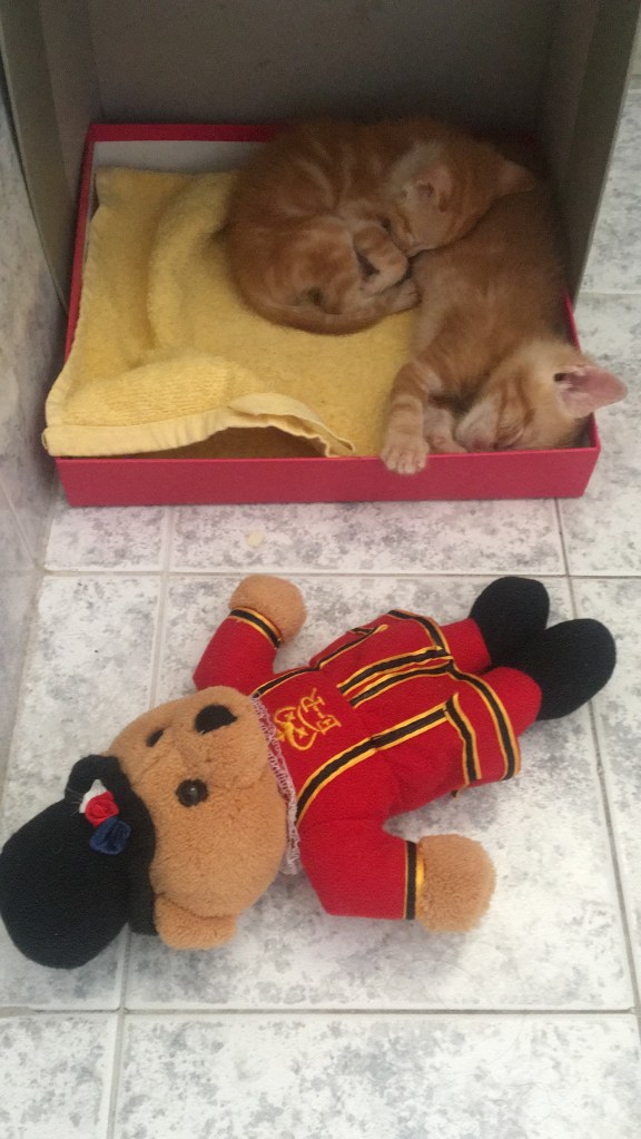 Just two years earlier, in 2016, we spent the entire summer living in the hamlet. It is the most peaceful place I have ever been, but the situation with the cats is pretty bad. A stray cat had a litter of kittens in a box outside my house, of which three females survived – one tortoiseshell and 2 gingers. At just a couple of weeks old, they developed significant eye infections, so I took them to the vet for treatment and isolated them in my bathroom to stop the mum cat moving them around so much. After two weeks of treatment, they were all healed.